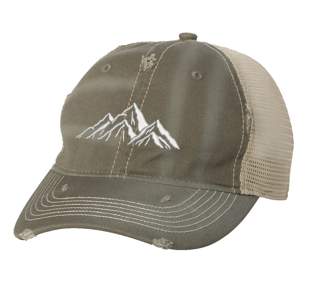 Hit the trails or the town in rugged style with our Embroidered Distressed Hiking Cap with Mesh Back — a cotton unstructured cap with breathable mesh and strapback closure. Designed for outdoor lovers and trail wanderers, this mountain trucker hat features a stitched outline of alpine peaks.